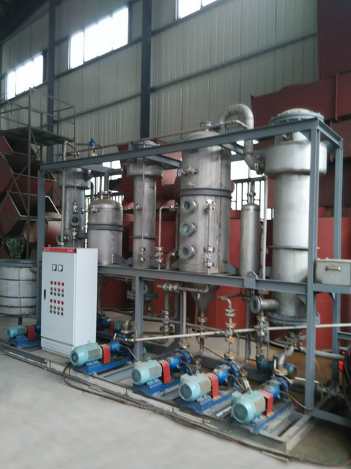 氯化鋁廢水蒸發器是低溫蒸發結晶這一工藝,其在裝置上,是有三效依次連接的強制循環蒸發裝置、三效依次相連的加熱器、稠厚器、冷凝器和真空泵,此外,還有軸流泵這一個。三效強制循環蒸發裝置是與稠厚器進行連接,起哦頂部出氣口是與汽液分離器進行連接,而汽液分離器則是與冷凝器進行連接。在加熱器的種類上,是采用雙流程加熱器,來減小各效中軸流泵的功率和流量。