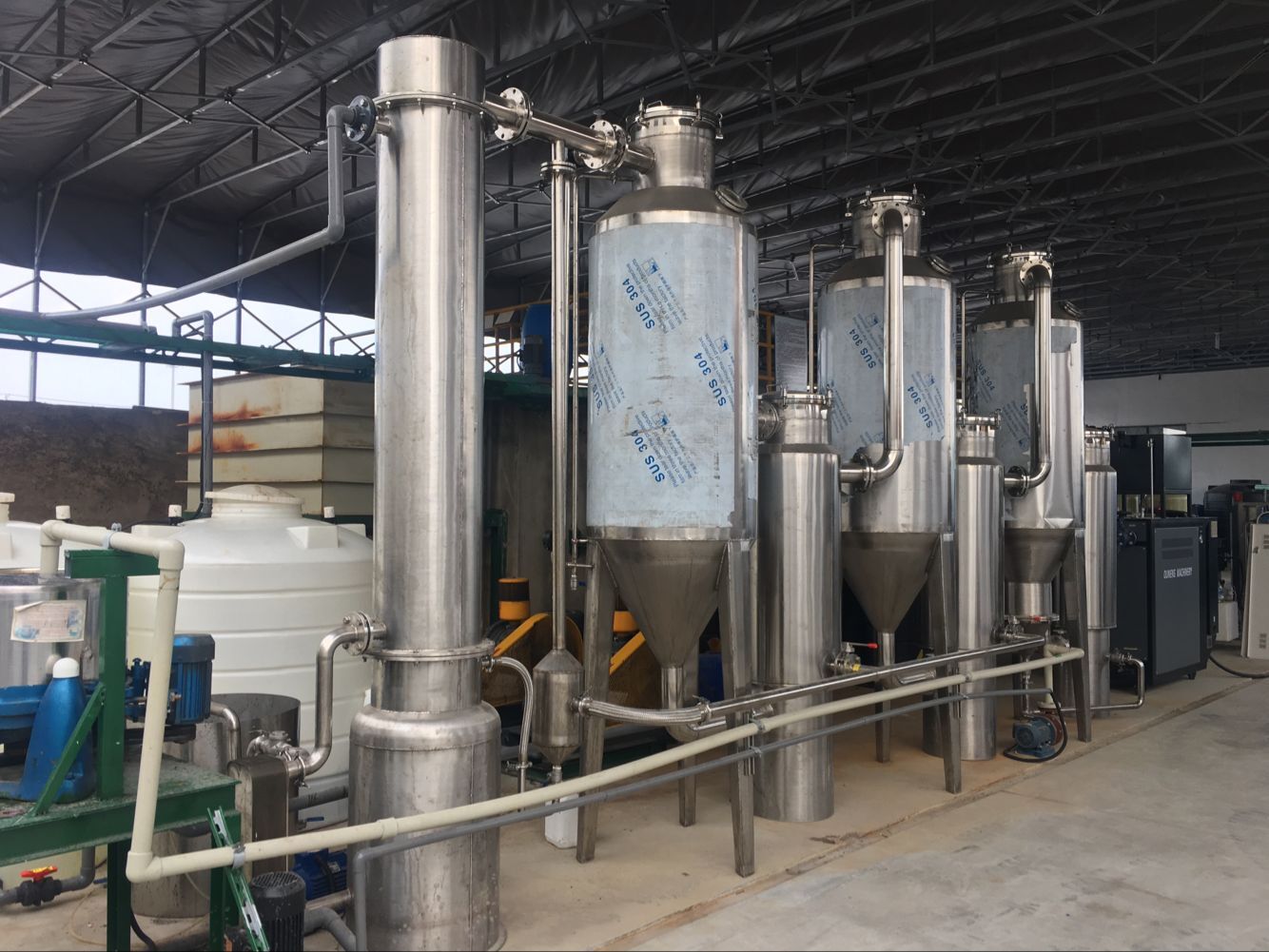 雙效蒸發器簡單的說就是兩個單效蒸發器串聯在一起,串聯的方式又分為并流、逆流、平流三種形式。加熱蒸發器、分離器、冷凝器、熱壓泵、保溫管、真空系統、料液輸送泵、冷凝排水泵、操作平臺、電器儀表控制柜及閥門、管路等系統組成。