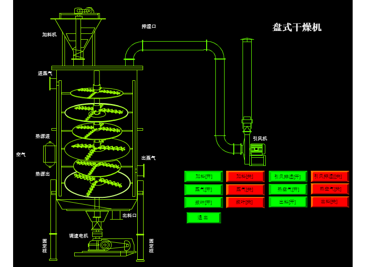 濕物料自加料器連續地加到干燥器上部干燥盤上,帶有耙葉的耙臂作回轉運動使耙臂作回轉運動使耙葉連續地翻抄物料。物料沿指數螺旋線流過干燥盤表面,在小干燥盤上的物料被移送到外緣,并在外緣落到下方的大干燥盤外緣,在大干盤上物料向里移動并從中間落料口落如下一層小干燥盤中。大小干燥盤上下交替排列,物料得以連續地流過整個干燥器。中空的干燥盤內通入加熱介質,加熱介質形式有飽和蒸汽、熱水和導熱油,加熱介質由干燥盤的一端進入,從另一端導出。已干物料從后一層干燥盤落到殼體的底層,后被耙葉移送到出料口排出。濕份從物料中逸出,由設在頂蓋上的排濕口排出,真空型盤式干燥器的濕氣由設在頂蓋上的真空泵口排出。從底層排出的干物料可直接包裝。通過配加翅片加熱器、溶劑回收冷凝器、袋式除塵器、干料返混機構、引風機等輔機,可提高其干燥的生產能力,干燥膏糊狀和熱敏性物 料,可方便地回收溶劑,并能進行熱解和反應操作。